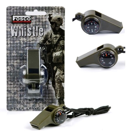 El silbato 3 en 1 es un imprescindible en cualquier equipo ya que ofrece 3 herramientas útiles en una sola: silbato de emergencia, brújula y termómetro.