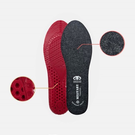Las plantillas militares de frío extremo de la marca española Footgel están fabricadas en una mezcla de lana merino, espuma de poliuretano 2,5mm de alta densidad y "termocrep-gel".