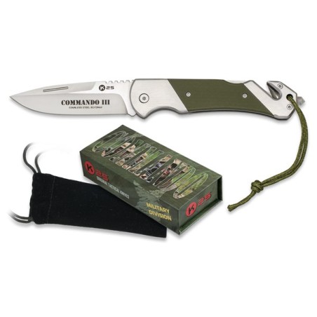 FICHA TÉCNICA: Marca: K-25 Modelo: COMMANDO III Mango: G-10 / acero inox Hoja: Acero Inox 8Crt13Mov Tamaño Hoja: 9 cm Tamaño mango: 12,7 cm Tamaño total: 21,7 cm Peso: 171 g INCLUYE: -Punta-rompevidrio -Corta-cinturón -Funda de nylon -Caja con cierre magnético