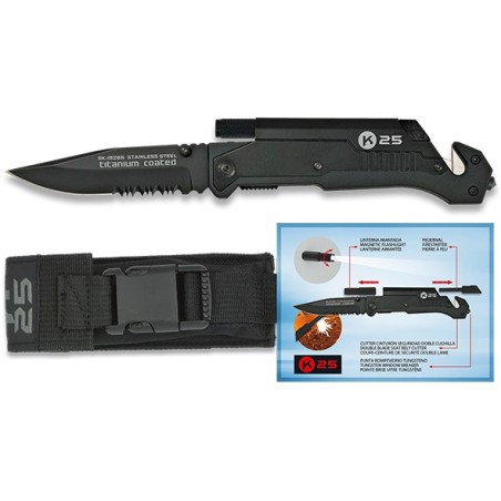 FICHA TÉCNICA:Marca: K-25Mango: AluminioHoja: Acero Inox Titanium CoatedTamaño Hoja: 8.8 cmINCLUYE:-Linterna imantada-Pedernal-Cutter cinturón de seguridad-Punta rompevidrio TUNGSTENO-Clip-Funda de nylonEstuche presentación