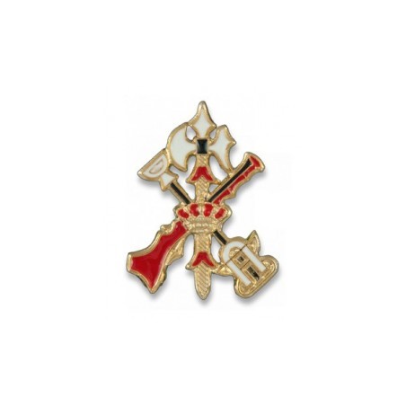 Mosquete y ballesta de oro pasantes en aspa, resaltado de alabarda de oro a su vez resaltado de corona real.