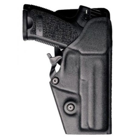 - Funda de uso profesional con un sistema óptimo de anclaje al cinturón y un sistema de seguridad que se activa de manera automática al enfundar el arma y se desactiva con un movimiento natural de la mano.