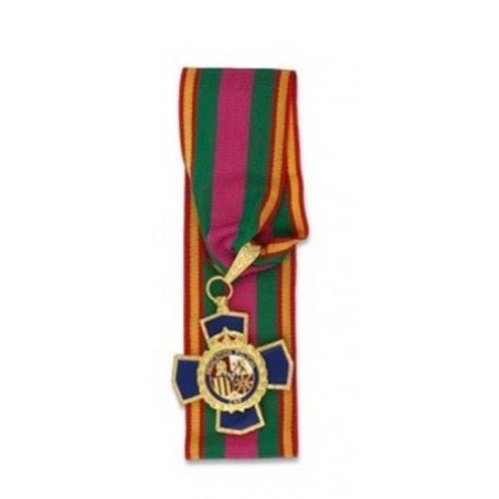 Acolada al escudo una cruz de cuatro brazos de ancho decreciente hasta el interior desde 18mm a 12 mm y apuntados en el centro, con unas medidas exteriores totales de 45 x 45mm, con esmalte a fuego azul (policial) fileteado en oro. Lleva una bola con anilla soldada al brazo superior, todo ello de color oro, para la sujeción del portacintas. El total de la cruz descrita será de cuarenta y cinco mm a la que irá unida por una a anilla en su brazo superior un portacintas, de al menos, 25 mm de largo x 8mm de ancho, conformando un tamaño total de la encomienda de 70 mm.